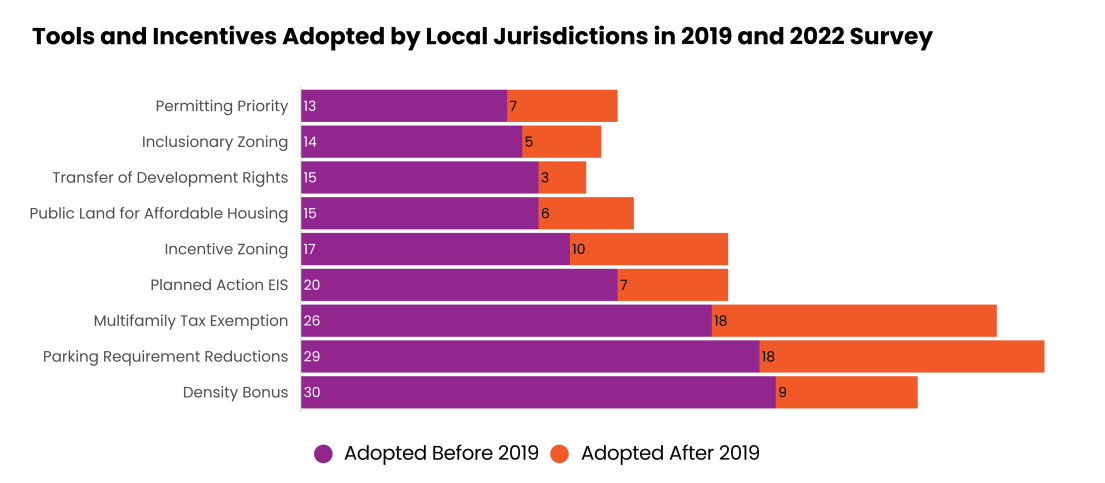 The 2022 Housing Incentives and Tools survey findings show local jurisdictions are working to address housing supply by adopting incentives to promote development and affordability. When calibrated to local conditions, incentives can be powerful tools and can reduce costs of developing housing, encourage higher density, and reduce costs of housing for renter and homeowners.